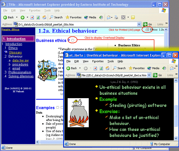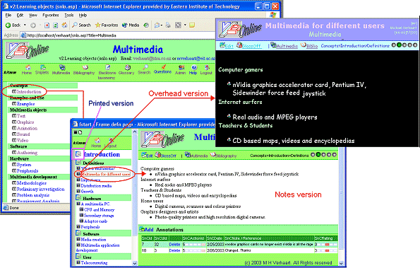 Michael Verhaart Verhaart, M. (2004, March), Beyond HTML: Creating Extensible Teaching Resources Using Database and Internet Technology. Bulletin of Applied Computing and Information Technology Vol. 2, Issue 1. ISSN 1176-4120. Retrieved from ABSTRACTIn the past few years as internet technology has become an increasingly important delivery mechanism in teaching and learning computing subjects, active research has been undertaken in attempt to utilize the technology and improve the quality of the resources used by learners. This paper discusses the development of a knowledge and content management system that is evolving to manage Learning Objects in a teaching environment. In the system, feedback mechanisms are being implemented to capture both lecturer and student knowledge and maintain the context of that knowledge. KeywordsComputing education, computing practice, Web-based learning, e-learning, learning objects 1. INTRODUCTIONDuring the mid 1990s, the author undertook much development work on delivering teaching resources in an HTML format. Conversion of existing electronic material was a labor intensive and time-consuming task, with each page having to be constructed individually into the HTML structure. The introduction of tools such as Microsoft’s FrontPage made this task less demanding, but still each page was a separate entity. 2. THE HTML SOLUTIONA significant advantage of creating material in an HTML format is accessibility. When content is presented in this format, particularly if it is placed on an Internet connected platform, it will allow access in the lecture theatre, computer laboratory or at home. As HTML is a common format, the material can be consistently displayed on a wide variety of computers across many operating systems. The primary drawback is the effort required to construct each page independently. If an ordered structure (taxonomy) is developed then positioning each page in this taxonomy can become difficult. In a printed book, page numbers keep a sense of order and position, but replicating this on a web page (commonly by using forward and back buttons) is a time consuming task, and is implemented in the same way a sequential update was achieved when tape drives were used to store database records. Embedded Java scripting was used to simplify this but unfortunately during page construction the JavaScript is replaced by a place-holder and needs to be viewed at run-time in a web browser, in order to check for accuracy. Cascading Style Sheets were introduced with HTML 4, which allows for better control of formatting and some independence from the strict formatting imposed in earlier HTML specifications. Unfortunately, this required all earlier HTML pages to be adjusted to take advantage of the Cascading style sheets. Ad-hoc enquiries were possible using Search facilities provided by the web server. The major drawback of these search results was the inability to maintain the context of the found web pages, with a random list of web pages delivered to the end-user. Accuracy and reliability of the pages also became a significant issue. With approximately 4000 pages, the ability to keep them accurate became increasingly difficult (as an aside if 1 minute was to be spent checking each page it would take more than 65 hours to check each one!). Often students would either verbally inform, or e-mail the lecturer to indicate a page had some inaccuracies. Matching up comments with the problem was a time consuming task, and more often than not pages were left as they were. In one recent case, a student indicated that a modern, multimedia PC was a 486 with 16MB RAM. When questioned, they indicated it was in the online material. 2.1 The structure of the HTML solutionIn order to deliver learning resources to students, two separate modes were developed. For the first mode, content was made available in a book format. Many of the students prefer to read the notes on paper, so the ability to produce content in a book format was desirable. Secondly, when delivering the content an overhead display format is required. A workable HTML structure evolved where each web page was designed to fit on one A4 printed page, and embedded graphic linked sections to a corresponding OHT. This is shown in Figure 1 and is explained in detail by Verhaart (2000).
