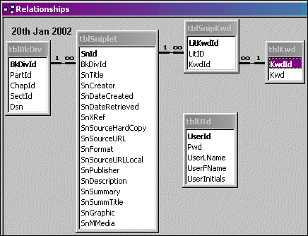As in all databases, it is important to work out the smallest workable unit or entity. After several prototypes, the content fragment that proved to be most workable was "a piece of knowledge or information that could be represented by one overhead transparency". In order to provide a way to refer to this, the term “Sniplet” was coined. In a sense, a sniplet is a specification for a type of learning object. The term learning object is grounded in an Object-Oriented paradigm and, as defined by the Learning Technology Standards Committee (LTSC) of the Institute of Electrical and Electronics Engineers (IEEE), is any entity, digital or non-digital, which can be used, re-used or referenced during technology-supported learning (IEEE, 1999). Others, such as DLNET introduce pedagogy into the definition as, a structured, standalone resource that encapsulates high quality information in a manner that facilitates learning and pedagogy. It has a stated objective and a designated audience (DLNET, 2002). These definitions are very broad and include not only the computer-based components, but also people, places, things and ideas (Wiley, 2000). For the development of a computer-based content management system, a clearer definition is required, hence the term sniplet was coined. The next step was to determine the technology that would be used to create the Prototypes. Microsoft’s Active Server Pages (ASP) was selected for three main reasons. First, ASP is based on Microsoft’s Visual Basic and this was within the skill set of the author, and secondly, MS-Access is easily integrated. Further, there are advantages with prototyping in MS-Access as all the necessary tools are available (File creation, relationships, forms and reports). Finally, a free web host called Brinkster with sufficient features to implement a solution was found. Details of the knowledge interrupt required to learn about the technology is explained in a paper by Verhaart and Jamieson (2002). In February 2004 this was moved to a New Zealand site http://is-research.massey.ac.nz/verhaart/ as part of ongoing PhD research. A simple prototype was developed. The essential attributes of the sniplet entity included a persistent identifier, title, description (for the notes) and summary (for the Overhead). Dublin Core metadata descriptors (1999) were used where possible. Secondly, the sniplets need to have some imposed order. Guarino and Welty (2002) refer to this as a "backbone taxonomy". At the stage when the prototype was being developed the author was following a book metaphor, so termed this the book division. A sample schema is displayed in Figure 2.