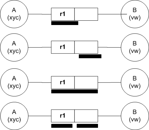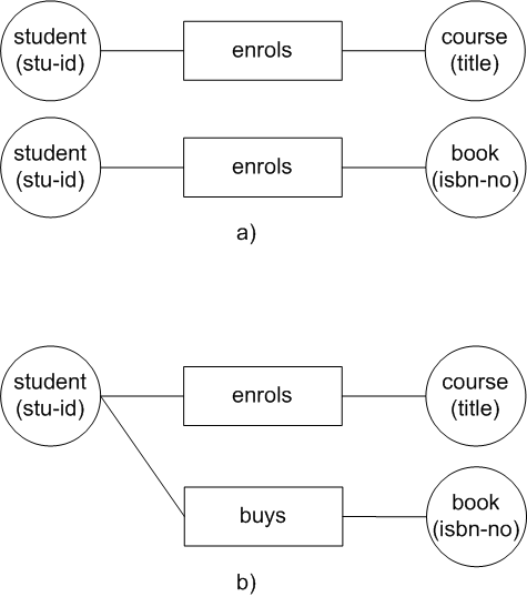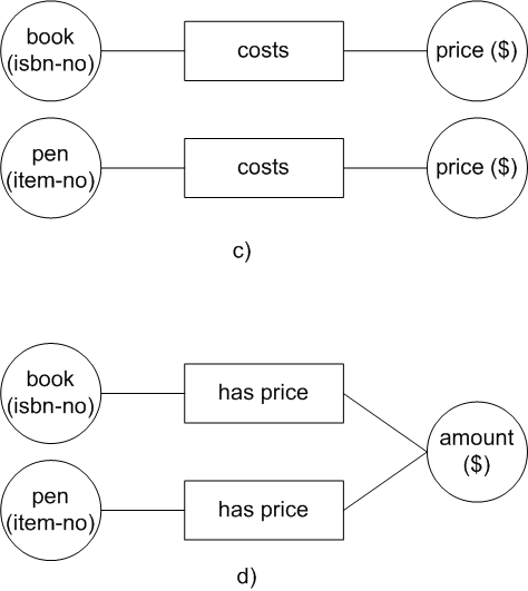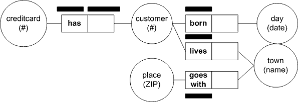 Other rules for simplifying the schema can be applied for example, the rule that entities which have the same role attached can be united into one entity. And last but not least is the rule that one can define all fact types which can be derived from other fact types by documenting the rule; this makes the schema simpler and easier to understand. 2.4 Adding Uniqueness Constraints to the SchemaAfter having done the third step the design comes to a stage where it may be viewed and understood easily. At this point uniqueness constraints can be added to the schema. Uniqueness constraints have to be added to each fact type, defining which label types will define that constraint. Each constraint is documented by a line under the corresponding roles connected to the relevant label types. A uniqueness constraint can be defined over one role or over several roles. The possible alternatives for a binary fact type and for a ternary fact type are shown in Figure 6 and in Figure 7 respectively.
