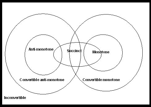 Certain types of constraints, such as Count(S) £ v are not succinct by definition. However they can be transformed so that they obey the succinct property (T.Ng et al., 1998). These types of constraints are referred to as “weakly” constraints, to distinguish them from succinct constraints which obey definition 3 without the need for any transformation. Recent research has highlighted the fact that constraints which were previously considered to be tough can be embedded into the mining process (Jia et al., 2002; Pei, Han, & Lakshmanan, 2001; Pei et al., 2004). This is achieved by re-ordering the items in either descending or ascending order. Constraints that exhibit anti-monotone or monotone properties as a result of the re-ordering process are referred to as convertible constraints. 2.2 Taxonomy of ConstraintsFigure 1 shows the classification of constraints and their relationships. As indicated in the figure, there is a category of constraints called Inconvertible. Certain constraints, such as avg(S) – median(S) = 0 that cannot be embedded in the mining process (Pei et al., 2004). This constraint requires an ordering in which the median in the itemset equates to the average. This ordering is not feasible in the natural ordering on items. Table 3 classifies each of the commonly used constraints into the three types of constraints: anti-monotone, monotone and succinct.