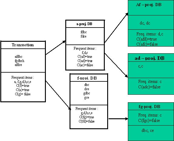 negative. Consider the prices of the items S= However, the disadvantage of this approach is that for each of the constraints the witness needs to be identified. Hence, this approach could be suitable only for specific constraints for which witnesses can be identified. For simple constraints, this approach might be suitable; however the extensibility of this approach for complex constraints is questionable. The algorithm Frequent Itemset Constraint (FIC) algorithm is another attempt at embedding tough constraints into the mining process. This algorithm arranges the item values in either ascending or descending order based on the requirements of the constraint. This is done to convert tough constraints into anti-monotone constraints which will enable them to be embedded into the mining algorithm. It then identifies the frequent itemsets and creates a database for each of the identified frequent itemsets. For every projection of the database, it scans and identifies the next level of frequent itemsets which satisfy the constraint and then projects the database for the resulting itemset. As illustrated in Figure 2, this process iterates until there is no itemset which satisfies the constraint. This approach has several advantages over Apriori. Two major advantages of this approach are: